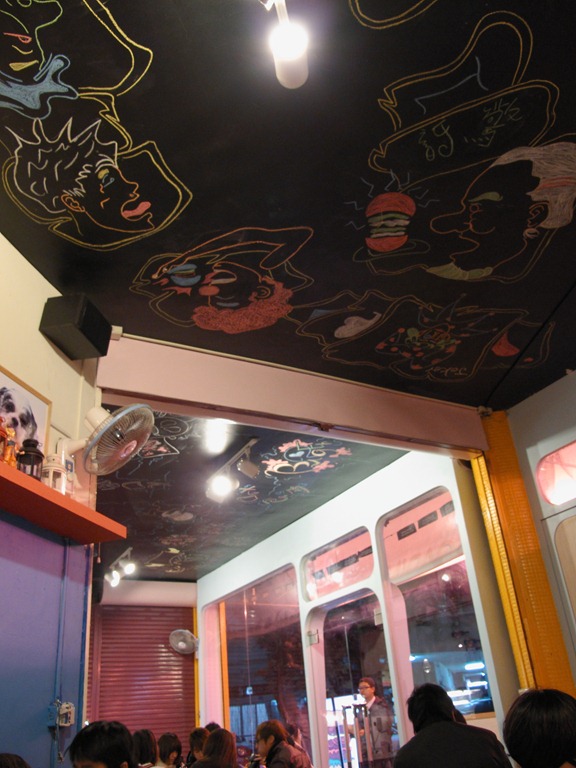 店內用餐空間很小,說穿了就是把騎樓改成用餐空間,店內也沒啥裝潢,不過天花板和牆面利用彩繪方式,倒是增加不少年輕氣息和活潑性
